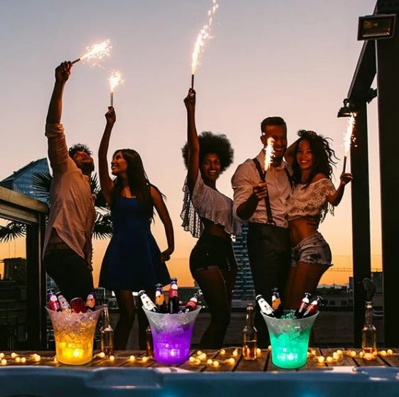 Transforma tus reuniones y celebraciones con el Parlante Hielera Bluetooth de 5 litros. Enfría tus bebidas favoritas y disfruta de un sonido envolvente acompañado de un show de luces RGB. ¡Todo en un cubo práctico y elegante!